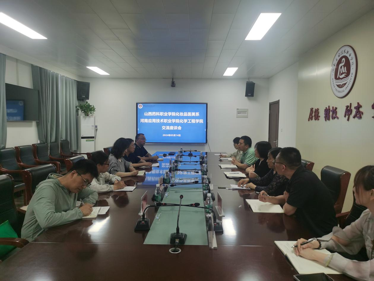 5月14日,山西药科职业公司化妆品医美系党总支书记范张姣、主任贾文雅,中药系主任蔡翠芳教授等一行5人到公司开展调研交流,公司党总支书记陈永惠,副经理岳瑞丰、柴凤兰出席,化妆品专业骨干教师参加了交流座谈。