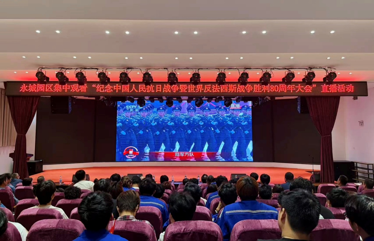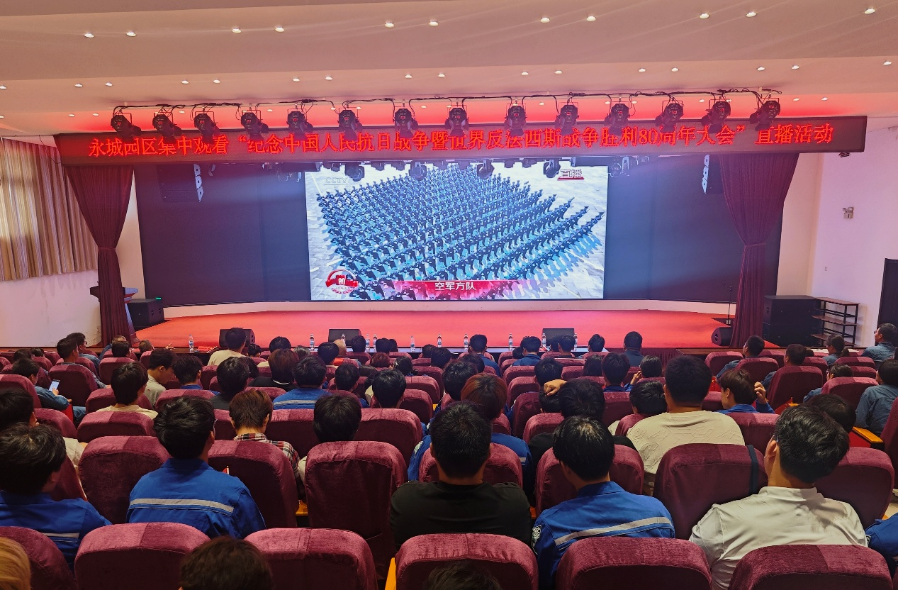 9月3日上午,304永利集团能源化工产业公司2401班的57名员工,在永城龙宇煤化工有限公司的礼堂,与单位职工代表一同观看了纪念中国人民抗日战争暨世界反法西斯战争胜利80周年大会直播。