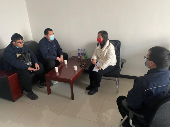 茹巧荣老师与实习员工代表进行交流,希望员工能够踏实工作,践行爱岗敬业的精神。员工表示通过实习自己认识到公司各项规章制度的规范性,体会到化工行业的重要性,为了更好地通过各项考核,平时对自己要求更加严格了,学到了知识,提升了技能。