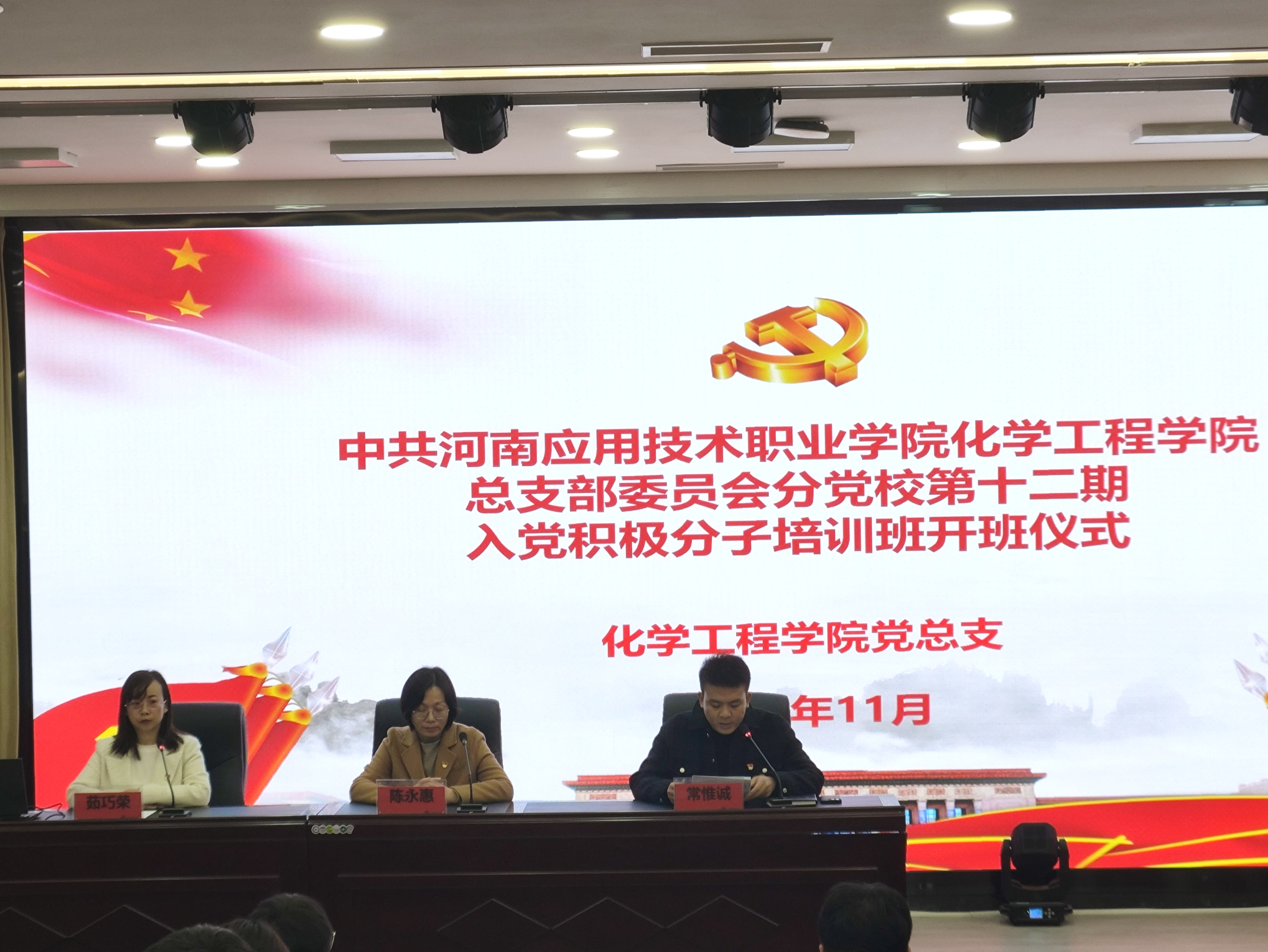 为深入学习贯彻习近平总书记关于党的建设的重要论述,进一步加强员工党员队伍建设,夯实入党积极分子的思想政治基础。2024年11月16日,化学工程公司党总支在郑州校区B楼学术报告厅举行第十二期入党积极分子培训班开班仪式。开班仪式由学工支部第三小组组长茹巧荣主持,公司党总支书记陈永惠,公司党总支副书记常惟诚出席开班仪式。