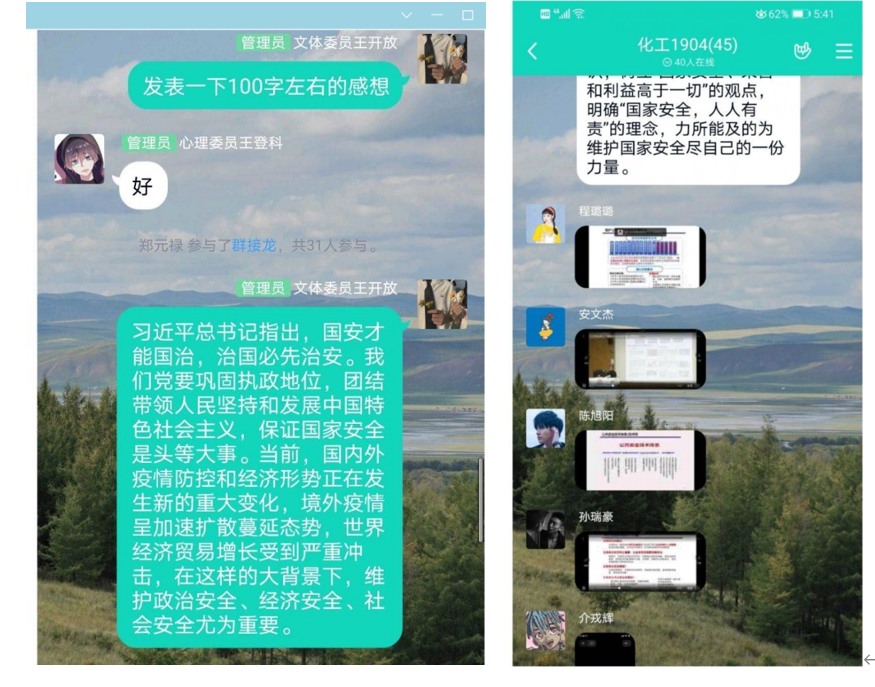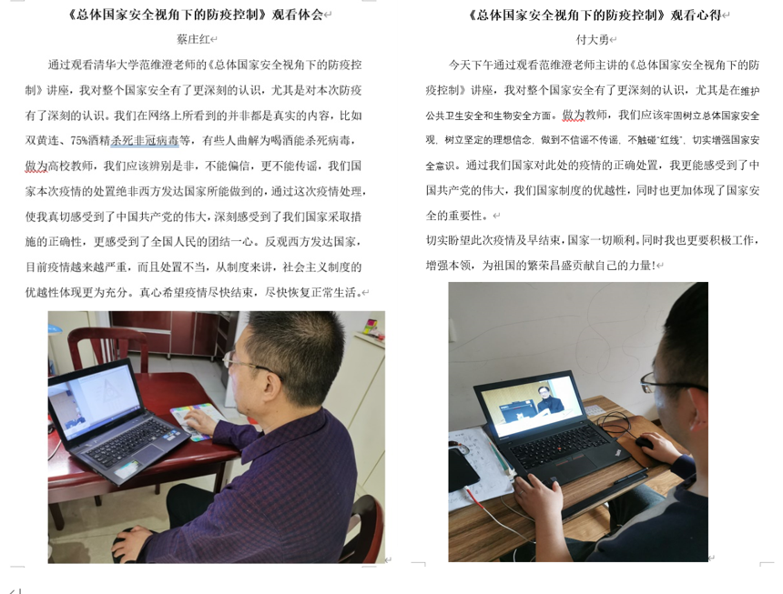 公开课后,304永利集团全体教师以观后感的形式进行交流和探讨;各班级在线上开展全民国家安全日主题团课,同学们积极参与,踊跃发言,收获良多。他们纷纷表示:这个特殊的时期,千万员工同上一堂国家安全教育课对于我们来说是十分有益的。这节课的主题是总体国家安全观视角下的疫情防控,其实,国家的安全与我们每个人的生活息息相关,人民安全是国家安全的宗旨,人民安全了,祖国才有希望。面对疫情,党中央高度重视,各级国家安全机关围绕中心、服务大局,为维护国家安全和社会大局稳定作出了重要贡献。