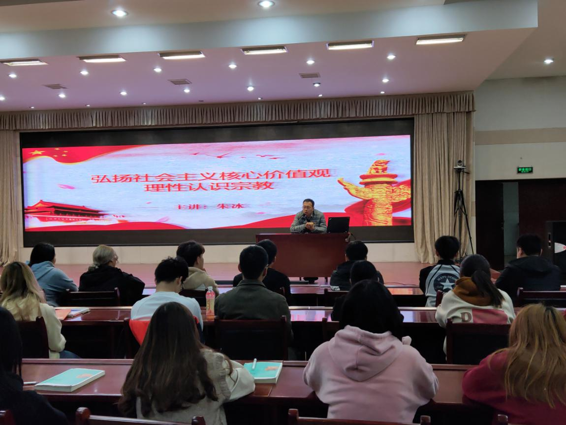 活动中,朱冰老师从什么是宗教、什么是信仰、信仰宗教的本质、社会主义核心价值观与宗教的差异、怎么样弘扬核心价值观等6个方面展开阐述。
