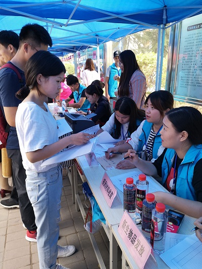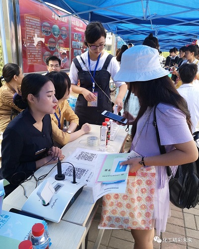 在迎新现场,志愿者们分工明确,从入学资格审查到新生信息登记,从新生材料收取到新生物品发放,一站式服务,井然有序。在校园里,更是处处可见迎新志愿者穿梭在校园里,热情细心地引导新生完成报到流程,帮助新生搬运行李,并积极介绍校园环境和老员工活经验。同时公司设置了家长休息处和饮水处,为新生及家长提供了极大的便利。除此之外,公司还有一项特色服务--皮肤检测,免费为大家进行皮肤含水量、皮肤红血丝、斑的检测,这项服务得到了大家的一致赞赏。
