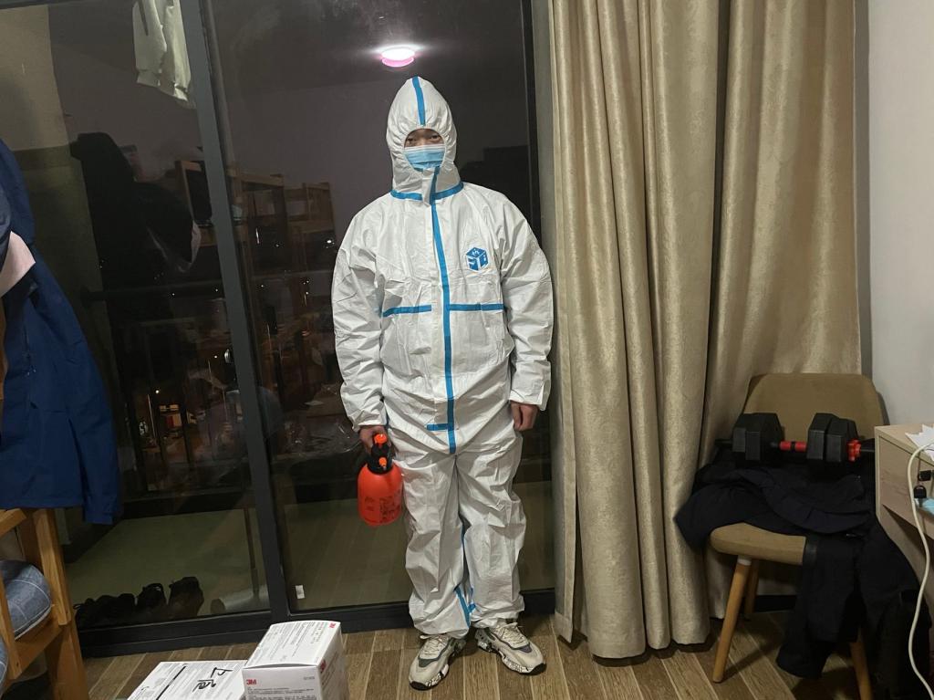 公司紧急招募志愿者,给隔离宿舍的员工送饭,他毫不犹豫,第一个报名,并动员本校同在中化蓝天氟材料实习的同学一起加入志愿服务队伍中。每天进行3次楼层消毒,早起提醒宿舍员工做核酸检测。