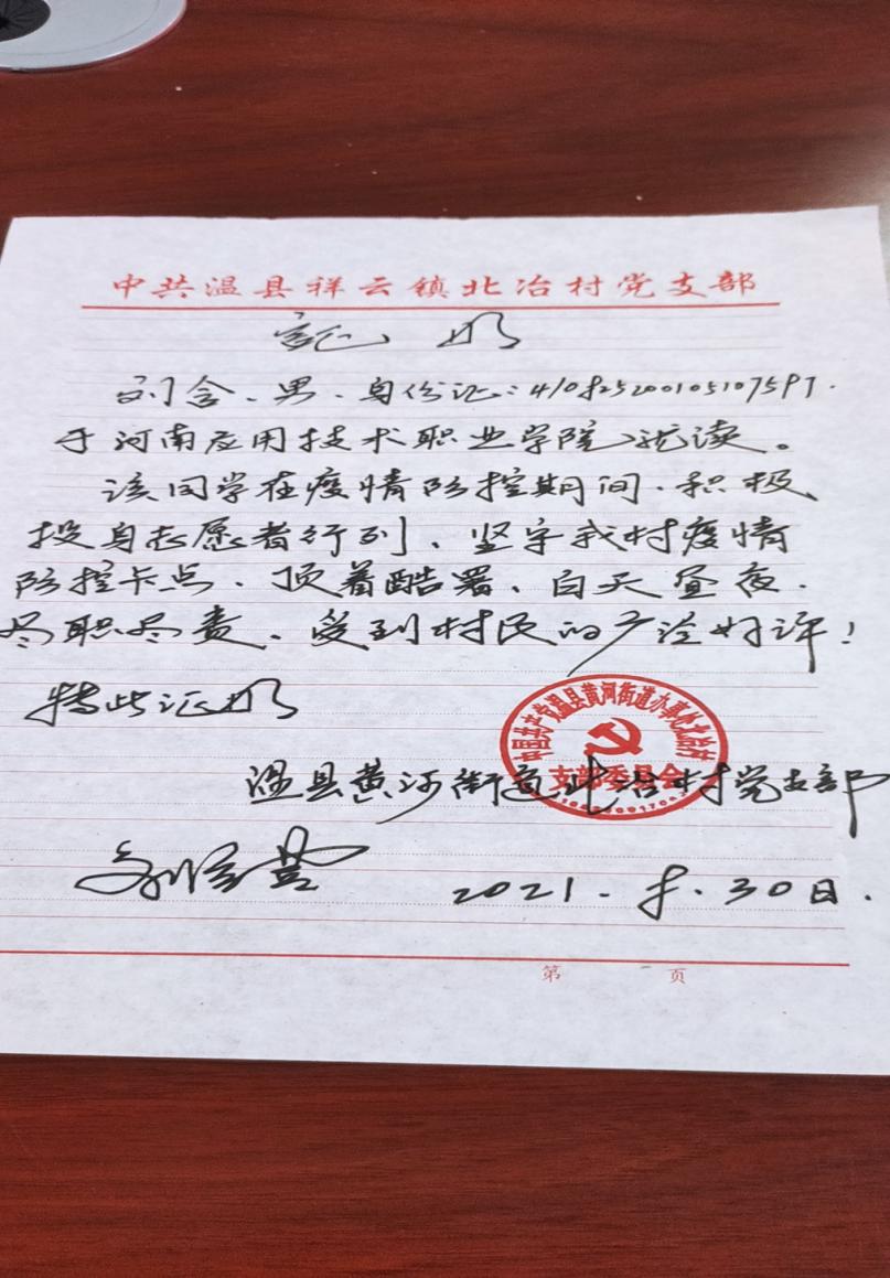 2021年8月3号开始,在河南省焦作市武陟县圪垱店乡圪垱店村村口卡点处值班,量体温、排查、宣传,排查每户基本信息和调查外来人员等基本信息,把排查到的基本信息录到电脑上。